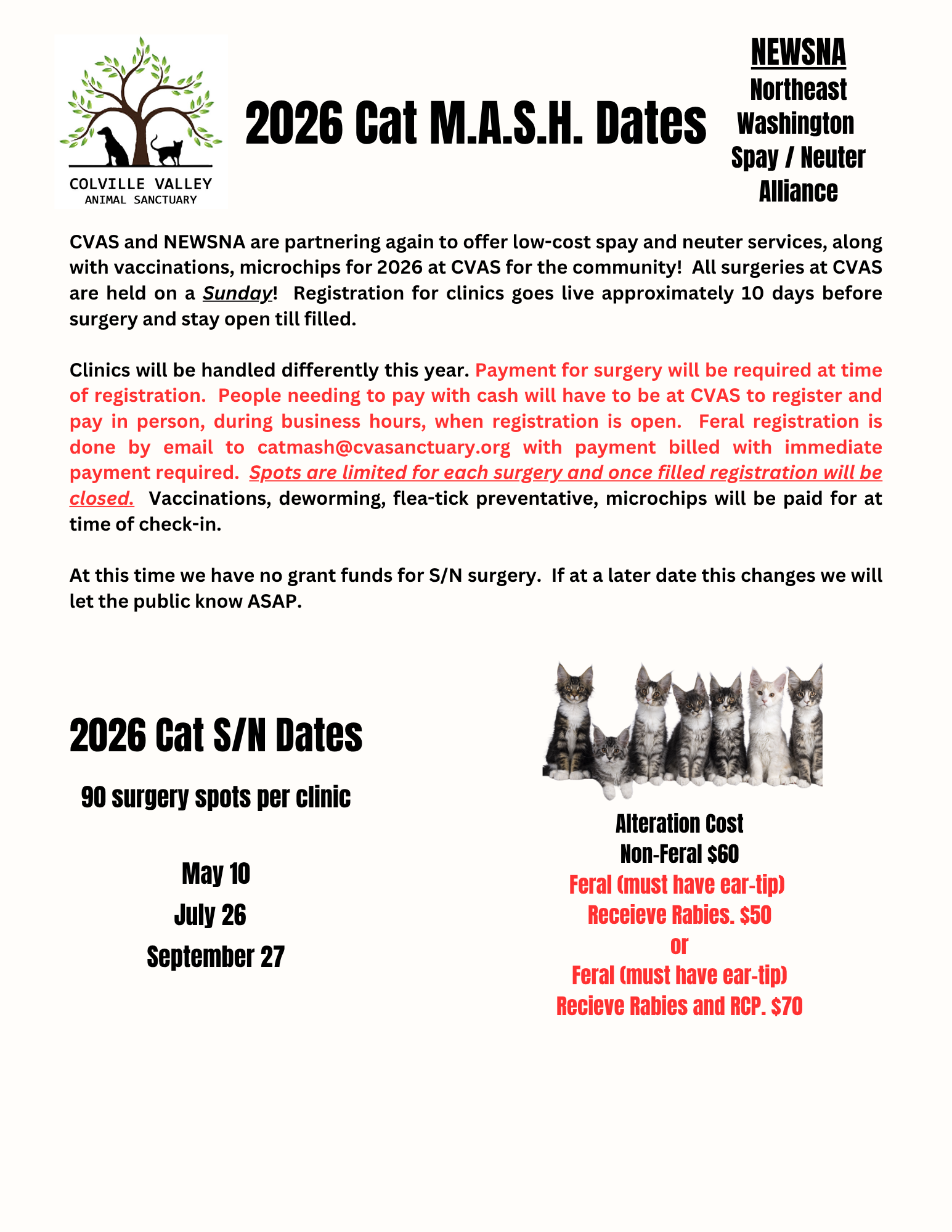 The Partnership between CVAS and Northeast washington spay neuter aLliance (NEWSNA) in 2026 is now set to deliver low cost dog and cat spay and neuter services at the CVAS facilities.