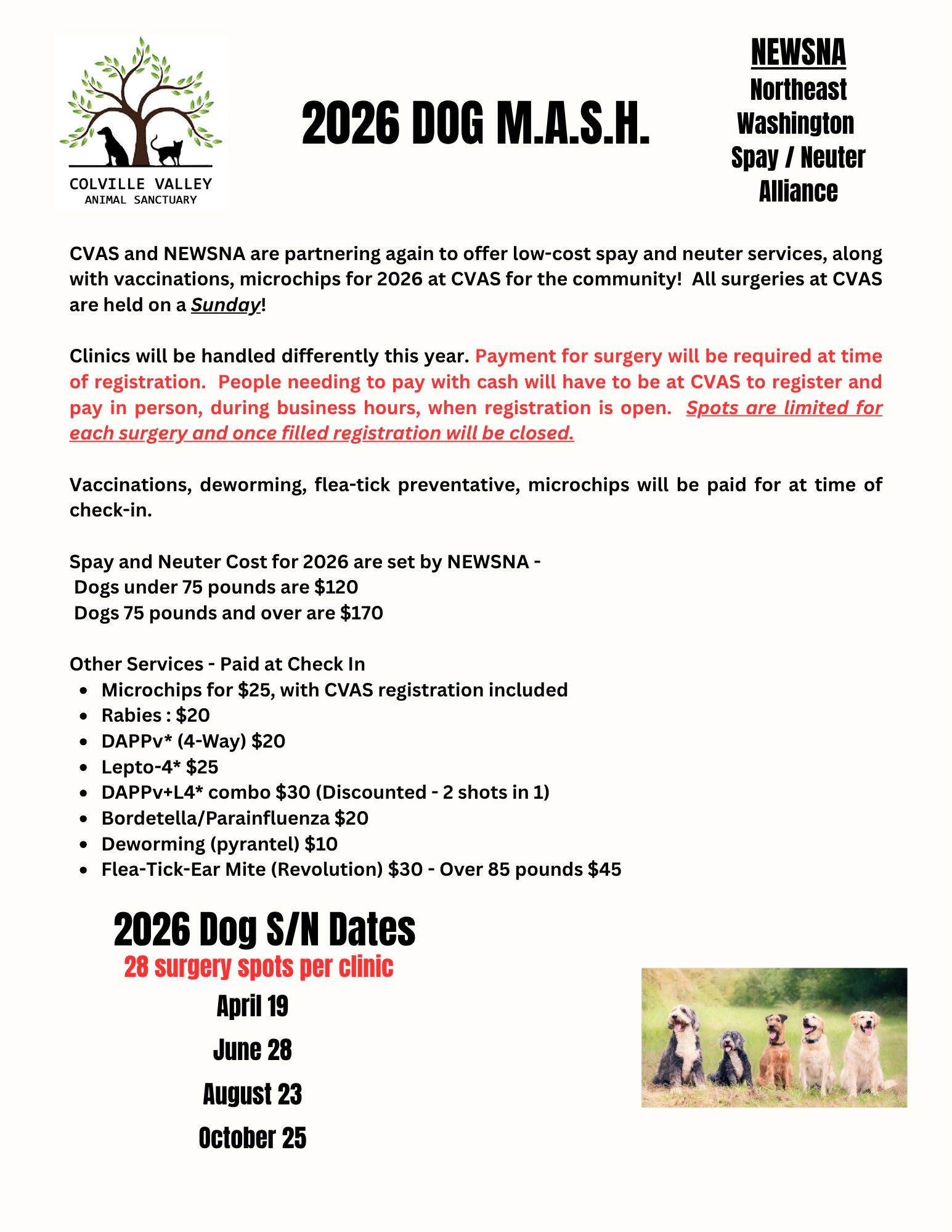 Link to register will be active about 1 1/2 weeks prior to an event and will be shut off once the clinic is full. We have 28 dog spots per MASH event. At this time we do not have grant funds to support low income members of the community. Once we find out if we are able to get a grant again this year, we will let folks know and how to apply for a grant based spay / neuter.